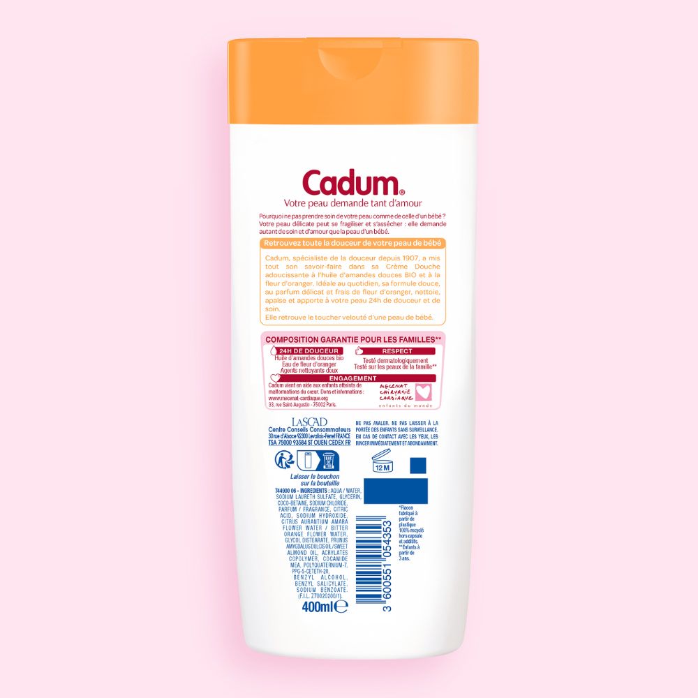 Cadum, spécialiste de la douceur depuis 1907, a mis tout son savoir-faire dans cette crème douche adoucissante à l’huile d’amandes douces bio et à la fleur d’oranger. Idéale au quotidien, sa formule douce, au parfum délicat et frais de fleur d’oranger, nettoie, apaise et apporte à votre peau 24h de douceur et de soin. Elle retrouve le toucher velouté d’une peau de bébé.
